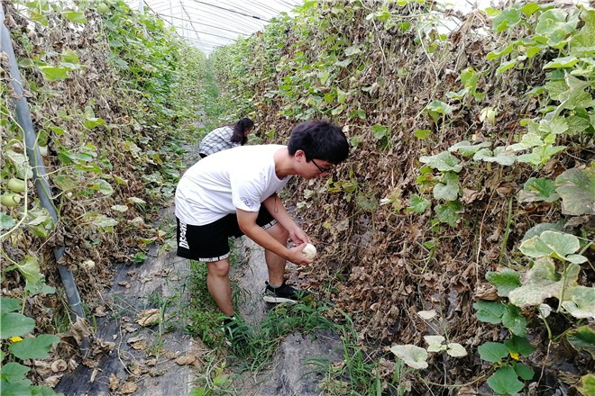 在与陶主任的交谈中,实践成员们了解到该基地包括25个种植室和1个移苗室。每年可以生产出大量地纯绿色、无公害、不打药的农产品。从育苗、土地培养、移植到施肥、浇水、采摘,每一个步骤都是由农民悉心操作,辛勤劳动。甜瓜每年一熟,从三月份起,就可以采摘,一直可以摘到八九月份。该大棚种植基地瓜果产量丰富,产品质量良好,每年有固定的销路。在这个交谈中,实践队成员们边参观边向陶主任请教知识,并且还一起亲身动手实践,切身感受,为村民们采摘甜瓜。