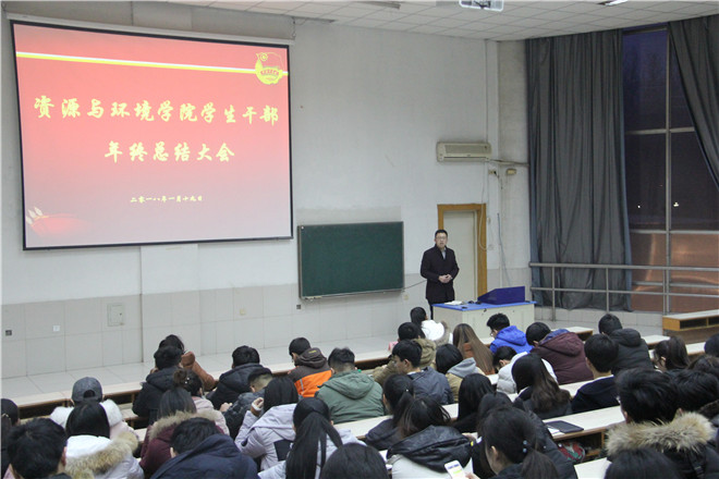 1月19日,资源与环境学院学生干部年终总结大会在第二教学楼201教室召开。学院2016级辅导员白健、2017级辅导员尹鑫、2014级辅导员高蓉蓉老师出席会议,院学生组织主席团、部长团以及各班班长团支书到场参加。