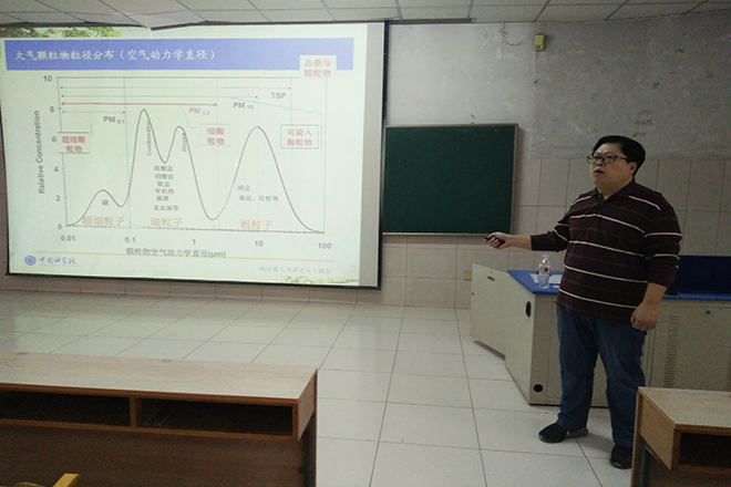 讲座伊始,王仲鹏老师先展示了一组城市雾霾污染的照片,点明雾霾给人类社会生活带来的不良影响,并借此对雾霾中的主要成分PM2.5与在场同学们进行了深入分析。王老师通过图文展示,从PM2.5是什么、PM2.5的危害、PM2.5的环境质量标准限值、霾与PM2.5的关系及危害、PM2.5的浓度分布及来源分析和个人防护六个方面,向在场的学生深刻阐释了“小颗粒,大世界”这一主题。王老师强调以PM2.5为主要成分的雾霾不仅造成大气能见度降低,影响人们的出行安全,更会对人体健康造成强烈伤害,严重有致癌的危险。同学们纷纷表示在这场讲座中了解到很多有用的知识,不仅认识到了PM2.5的危害,还学习到了有效的防护措施。