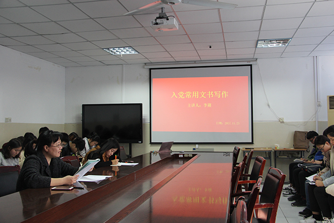 11月23日中午,资源与环境学院入党积极分子培训班第三讲在九教301顺利开讲。资源与环境学院学办主任李蘋老师对入党积极分子作入党常用文书写作的培训指导。