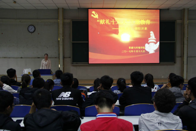 10月18日,中国共产党第十九次全国代表大会于北京开幕,国家主席习近平代表第十八届中央委员会向大会作报告。为学习党的十九大精神,资源与环境学院响应校团委号召,于星硕自习室开展“献礼十九大——砥砺奋进,继往开来”主题教育活动。学院2017级辅导员尹鑫到场与会,2017级全体学生参加活动。
