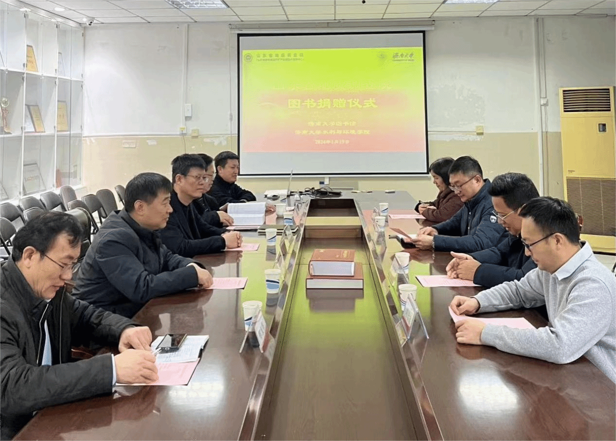 1月19日下午,山东省地质调查院《中国区域地质志·山东志》赠书仪式在9728太阳集团举行。山东省地质调查院副院长朱恒华、技术质量科主任张华平、水文环境地质所所长刘春华、副所长刘治政,太阳成集团tyc9728图书馆馆长王爱国,9728太阳集团党委书记王义、常务副院长王仲鹏及部分教师代表出席仪式。