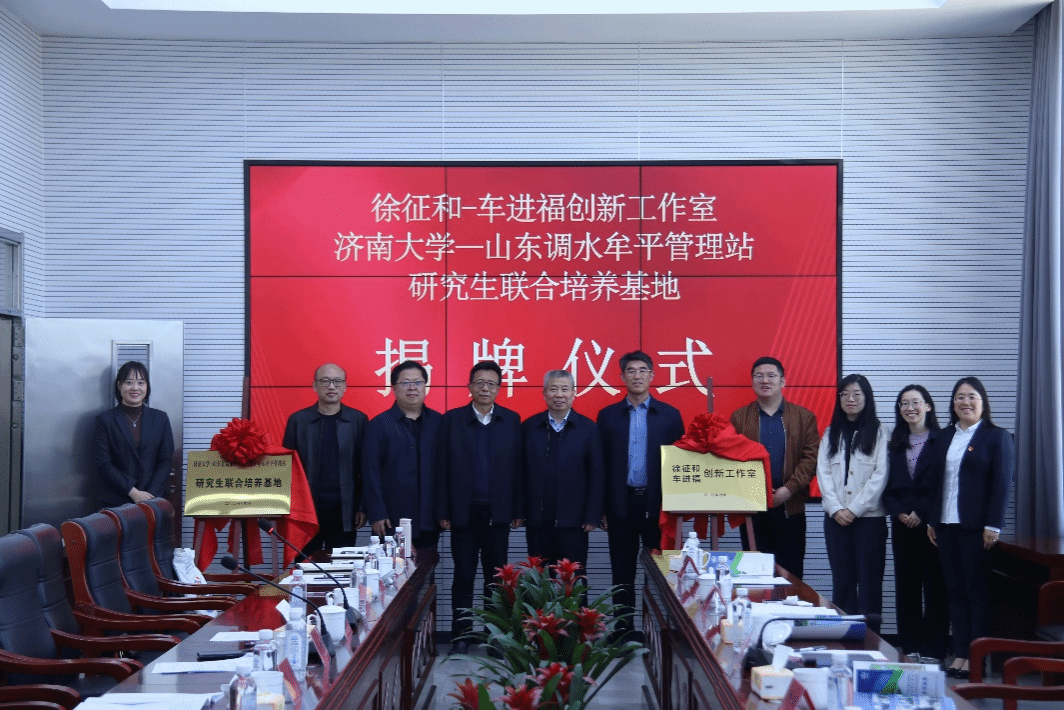 参观结束后,双方在星石泊泵站会议室举行揭牌仪式。仪式上,孔祥升书记致辞中表示了双方合作的重要性和必要性,希望双方充分发挥研究生联合培养基地的作用,立足当前、着眼长远,以实践为导向,紧密关注社会需求,积极探索新工艺、新技术、新方法,以此推动科技创新成果的有效转化。徐征和处长表示,打造研究生联合培养基地是深化产学研融合发展的重要渠道和有力抓手。双方立足各自特色,建立教育资源共享机制,在招生、教学支持服务,研究生培养、管理等方面展开深度合作,这不仅有助于双方共同探索创新人才培养的新机制,也为山东调水高质量发展塑造新动能、开辟新篇章。王仲鹏院长在发言中希望通过此次研究生联合培养基地合作,双方深入开展理论联学、人才联育、科研联攻,实现资源共享、优势互补,对促进高校人才培养、增强单位科技创新能力,推动双方实现高质量发展具有重要意义。