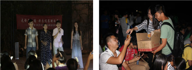 文艺汇演开始之前,侯老师代表资源与环境学院对新生致以亲切慰问和节日祝福,并在现场亲手为新生发放月饼。叮嘱新生在活动结束后及时与家人联系,给亲人报个平安。