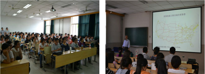 本次讲座姚士谋教授主要围绕“全球经济一体化与城镇发展”、“我国城镇发展与问题”、“新常态下我国新型城镇化的若干问题”三个方面进行分析论述,通过将 中国与美国、法国等其他发达国家对比,分析出当前新型城镇化对我国城镇主体产业发展的思维导向,引用以色列城市生态文明建设实例分析工业化进程中第二产业 向第三产业转型过程中低碳城市建设。在场同学们认真记录,积极思考,纷纷表示通过和姚教授互动交流对相关专业知识有了更好的理解和掌握。