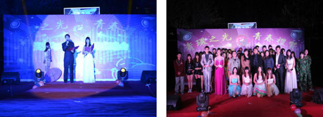 伴随着炫目的灯光和动感的青春旋律,晚会准时拉开序幕。本场晚会歌舞、小品、朗诵、乐器联奏等多种形式,内容别出心裁,融合了时尚、环保与民族元素,可谓精彩纷呈。陈书记和主持人合作现代诗朗诵《雨巷》,为现场营造出朦胧幽美的氛围;黄老师、王老师也现场为大家献上歌曲《笔记》、《栀子花开》;犹如天籁的器乐合奏《天空之城》将观众带入童真愉悦的梦境,百折千回,意蕴深远;相声《叫卖图》一出场便赢得阵阵掌声,两位演员的一板一式,一唱一和,引发晚会小高潮;民族文化展示和歌曲《中国人》、《走在山水间》等民族特色节目,以动感的音乐和韵动的舞姿,让观众领略到不同民族的文化特点,抒发了当代青年的爱国情怀;随后,美女靓男身着纸张与塑料袋制作的环保礼服,在缓缓的音乐中迈着优美的舞步穿梭在舞台间,表达着保护资源保护地球的环保理念;一首《光阴的故事》绽放出青春与梦想的光芒,为本场晚会划上了圆满的句号。