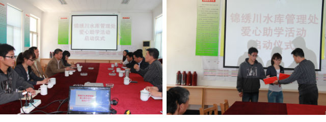 启动仪式于上午十点半在锦绣川水库管理处会议室正式开始。首先,管理处张景涛书记对水库各方面情况进行了简单介绍,同时阐明了此次爱心助学活动的目的和意义。随后,锦绣川水库管理处对我院两名水文与水资源工程专业贫困生进行了现场捐助。本次资助的两名学生家庭经济条件十分艰苦,但他们坚韧自立,在校表现突出,品学兼优。与此同时,两名得到资助的同学也难掩心中感激之情,纷纷表达了自己要树立强烈的社会责任感,努力学习,回报学校和社会的决心与信心。他们在“5·4青年节”之际道出了当代大学生不畏艰难、奋发向上的心声,得到了在场所有人的肯定和赞扬。
