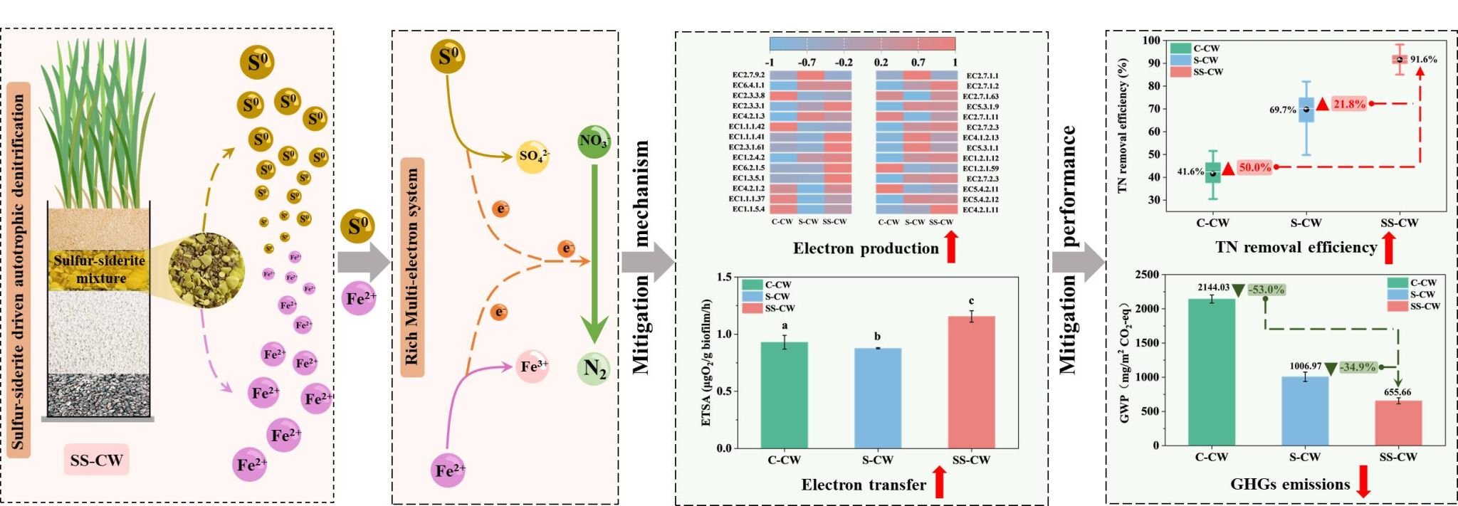 人工湿地由于绿色生态和经济可行的优势而被广泛应用。然而,在处理低碳氮比废水时,传统人工湿地的脱氮效率往往受限于碳源缺乏,且其运行过程中会不可避免地产生温室气体,增加了碳足迹,限制了其应用场景。硫-菱铁矿自养反硝化(SSAD)工艺使得生物脱氮过程摆脱对碳源的依赖,是一种极具潜力的新型脱氮技术。本研究通过在人工湿地中构建铁硫胶膜多电子体系,旨在强化人工湿地水质净化效果的同时控制温室气体排放,为提升人工湿地的整体环境效益提供新思路。
