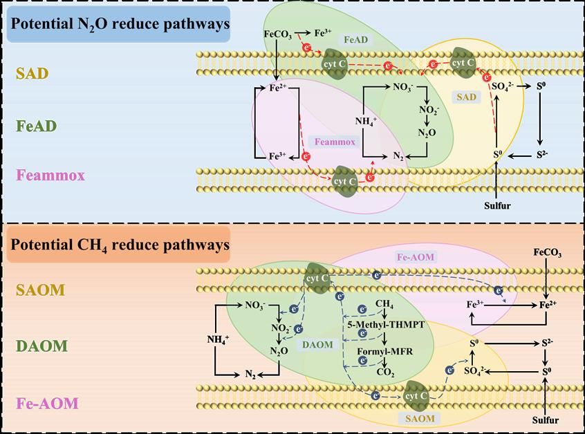 图2 铁硫胶膜多电子体系中典型温室气体减排机理图