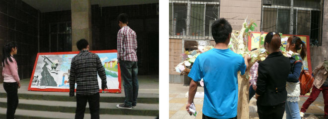本次“环保周”活动为期五天,将分别在八食、二食广场全面展开,通过采访相关组织人员,我们了解到此次活动的主题为“节约资源,大力建设生态文明”。活动现场,最引人注目的是由4000多根废旧一次性筷子制作的“筷子许愿树”,寓意着“如果没有水,树木就会干枯如筷子一般”,警示大家切勿乱砍乱伐。此外,呈水龙头状的“净水节水装置”也吸引了不少同学驻足观看,长长管子似向一个容器中注水,却发现容器中只有沙粒石头,暗示同学们生活污水将引起严重的水土流失现象。