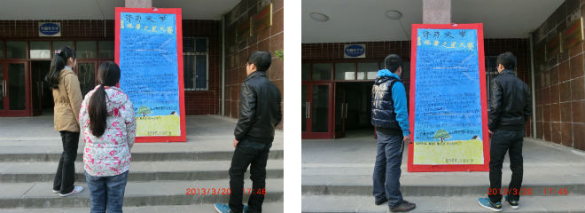 在百花盛开、万物复苏的美好时节,我校第五届“记者之星”大赛迎着春天的朝晖拉开序幕。资源与环境学院紧紧围绕活动主题——“又见花开时”,制作精美的展板向同学们展示了作品形式、征集时间、投稿方式和参赛作品要求。同时,资源与环境学院记者团向11级、12级各班团支部印发了活动策划书,鼓励同学们积极参赛。此外,资源与环境学院同此开展新闻作品征集活动,培养同学们的新闻洞察力和敏锐感,引导大家关注时事热点,树立社会责任感。
