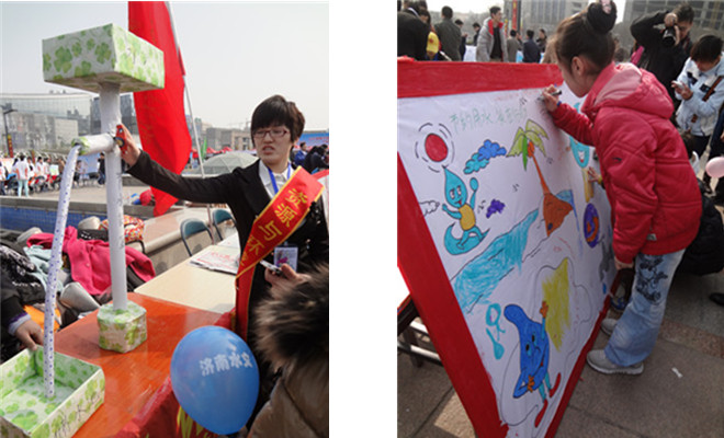 为纪念世界水日,世界气象日和中国水周,增强市民的节水意识,呼吁全社会共同参与和理解配合节水行动,太阳成集团tyc9728资源与环境学院于3月23日上午在济南市泉城广场参与了由省、市水利局和气象部门主办,历下区税务局和济南时报协办的“山东省暨济南市纪念世界水日、世界气象日大型宣传活动”。