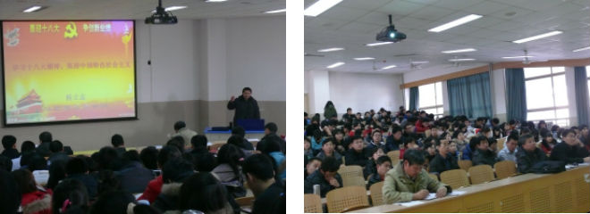 杨立志副教授首先讲述了十八大胜利召开对国家发展的重要意义和巨大影响,随后带领大家重温了十八大报告中十二个方面的主要内容。杨立志副教授结合邓小平理论以及中国改革开放的盛况,对十八大内容作了详细深入的剖析。报告会深入浅出,精彩凝炼,从中国特色社会主义是当代中国发展进步的旗帜和方向出发,让大家深刻领会了中国特色社会主义道路、理论体系及制度的辩证统一的内容和继续深化改革开放,全面推进经济、政治、文化、社会、生态文明、国防和军队的建设,实现中华民族的伟大复兴的重要性,剖析了党的根本目标对祖国未来发展的影响力。最后,马振民书记对本次报告会进行了总结,并号召全体教职工党员以实际行动积极学习贯彻落实十八大精神,扎实做好本职工作。