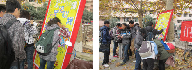 活动一开始,色彩斑斓的展板吸引了大量同学驻足观赏,在听取学生会工作人员就此次活动目的和参与方式的热情讲解后,同学们纷纷表示愿意加入活动中,为资源与环境学院迎新晚会写下自己的祝福。在工作人员的组织下,同学们将自己的心愿及联系方式写到便利贴上,然后有序的贴在心愿收集板上。大家的心愿各有不同,有的同学预祝迎新晚会成功举办,体现出对学院学生工作的大力支持及对迎新晚会的良好祝愿,有的同学写下了自己想要在迎新晚会上看到的节目,表现出对晚会的期待和对文艺的热爱。此次活动征集的心愿将在资源与环境学院迎新晚会上作为抽奖环节的奖券使用。