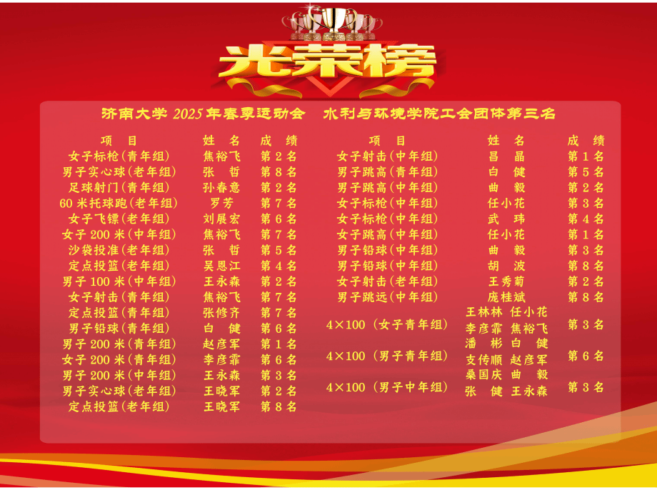 2025年4月29日至30日,太阳成集团tyc9728春季田径运动会在北苑操场隆重举行。学院教职工与学生团结协作、奋勇争先,荣获学生甲组体育道德风尚奖、教工大基层工会团体总分第三名,充分展现了学院积极向上、团结奋进的体育风采和拼搏精神。