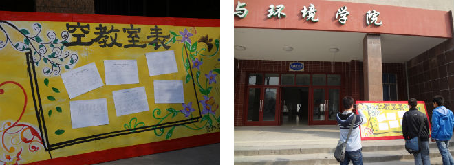 据不少同学反映,选择自习教室极为麻烦,由于不知道教室是否有课,经常不停的转移找空课教室,十分浪费时间。资源与环境学院学生会生活部积极响应,明确列出了第二、第十、第十一教学楼各个时间段空闲的教室,绘制并展出在第九教学楼的宣传板上,内容简洁明了,使同学们一目了然。方便同学们更好的自习。展板一出,受到广大同学的一致好评,积极查课的情况表明此次活动的正确性。