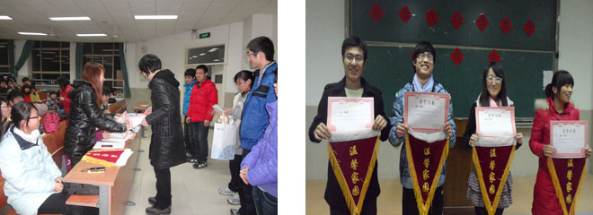 为了向我院同学展示“宿舍文化月”活动开展以来取得的成果,我院自律会舍管部于12月11日晚7点在11教1段501成功举办了“宿舍文化节”颁奖典礼。自律会主席田雨、副主席刘香花作为特邀颁奖嘉宾出席了此次典礼,所有在此次活动中获奖的宿舍代表都参加了此次活动。