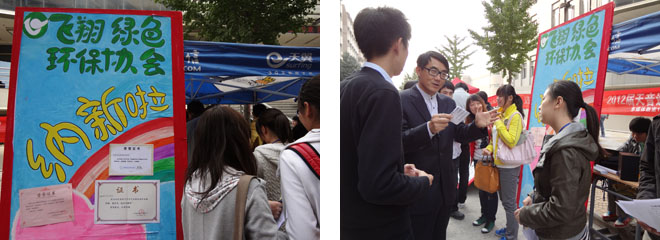 纳新场地附有展板,是对飞翔绿色环保协会自2000年成立以来成果及荣誉的展示。陈卫东书记表达了对本学院该协会的美好祝愿。飞翔绿色环保协会成立于世纪之交的2000年,以“爱护我们共同的家”为宗旨,以“飞翔绿色梦想,环保从我做起,树立品牌意识,打造品牌社团”为发展思路,向广大师生、社会各界人士,展开当今环保的新动态以及环境状况,宣传环保的重要性及环保的切实行动举措。该社团成立以来,成果显著,在每年的世界水日及世界环境日中积极筹备关于环保的各项活动,引起师生和各界人士对我们赖以生存的生活环境的广泛关注。