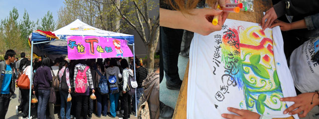 为树立大学生环保理念,培养大学生创新意识。由资源与环境学院学生会外联部及宣传部联合举办的“我的设计我作主”手绘T恤活动于2011年4月13日在八食广场顺利举行。本次活动形式新颖,迎来了学生们的广泛关注及其好评。