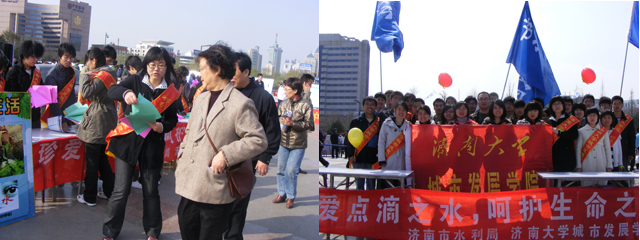 3月22日,世界水日之际,山东省水利厅和气象局主办的“山东省暨济南市纪念‘3.22’世界水日‘3.23’世界气象日大型宣传活动”在泉城广场举行,城市发展学院青年志愿者积极参加宣传活动,并以“珍爱点滴之水呵护生命之权”为主题,大力宣传节水保泉。