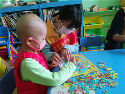 下午2点20分,志愿者们准时在学校新西门集合,一同乘车去往市儿童医院血液肿瘤科的“阳光病房”。为给孩子们营造一个安全无菌的环境,让孩子们放心的玩耍,志愿者们首先对教室环境进行全面消毒。下午3 时左右,孩子们陆陆续续在家长的引领下走进了阳光病房,志愿者们正式开始上课。也许是病痛的折磨,有的孩子几乎不说话,只是静静的摆弄着拼图。不过志愿者们也不强求孩子们说些什么,只是安静地陪着他们一起玩并且不时地讲一些有趣的事情。也许是志愿者们的热情感染了孩子们,孩子渐渐开始对志愿者们打开心扉,话也多了起来。在交流中,志愿者们发现这些孩子们其实与普通的孩子们并没有差别,甚至有些孩子的想象力与空间想象能力比好多普通的孩子更加出色。下课后,孩子们与青协服务队的志愿者们依依不舍的挥别,孩子们的童真和可爱让志愿者们欢心也让他们感到同情,他们表示以后一定要经常过来陪陪孩子们。