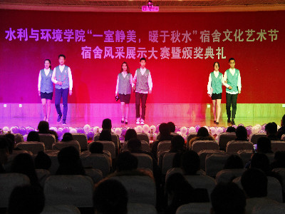 当晚的宿舍风采展示大赛,分为两个篇章进行。篇章一“仙山琼阁PPT展示”:宿舍代表分享舍员间的点滴,介绍宿舍的规章制度,解读舍徽等文化符号,表达对舍友的感谢感激之情。篇章二“芳年华月才艺展示”,通过宿舍集体的才艺展示,展现宿舍成员间的点滴友情。展示大赛中场时更有精彩的乐队表演及颇具创意的马甲走秀,绿马甲为我院首创,以“律己律人”为宗旨,服务学生成长,服务学院发展。