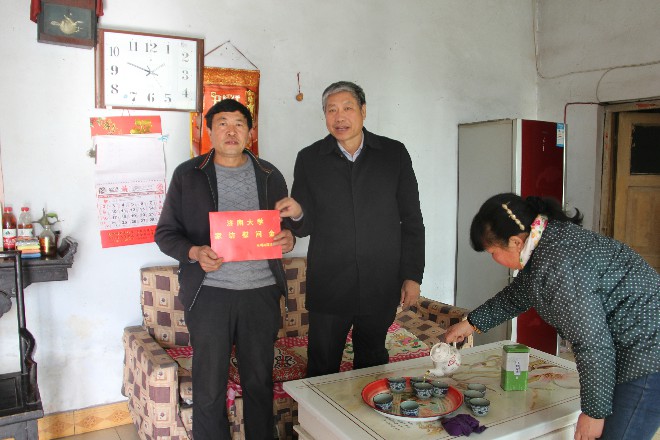 当天下午一点三十分,家访小组到达小张同学家。小张同学早早地在村口等待,小张父母对老师们的到来表示热烈欢迎,马上招呼老师们进屋。马书记与学生家长拉起家常,关切的询问家里目前以什么为主要经济来源,地里的农作物收成怎么样,身体有没有好一些,家里通过什么取暖等等,近距离地聊天,直接地拉近了学校与学生家庭的心理距离。随后小张同学的辅导员白老师将学校为建档立卡家庭学生准备的书籍、书签等大礼包拿给学生,同时一方面向她父亲详细介绍了小张同学近几年的获奖情况,另一方面根据学生在校期间的优秀表现,对她所学专业的发展前景、求职就业现状等问题进行了详细的分析和阐述,并向张同学提出清晰职业规划的建议。边书记在交谈中说到:“小张同学在学校的表现很优异,不仅在学业上刻苦钻研,在生活上也与同学互相帮助,处处为同学们着想,希望小张同学再接再厉,为学生们树立榜样,成为有用之才。”在聊起学校对于贫困家庭态度的时候,马书记表示对于经济困难家庭学生的资助是太阳成集团tyc9728一等一的大事,学校不会放弃任何一名学生,随后便向小张同学家长详细介绍了学校、学院的资助政策与帮扶措施,表示学校一定会尽最大的努力去帮助贫困学生完成学业。家长听后非常激动并表达出对学校的感谢,说一定会好好配合学校,给孩子一个美好的未来。相信在学校与家长的鼓励下,小张同学定会前途无量。