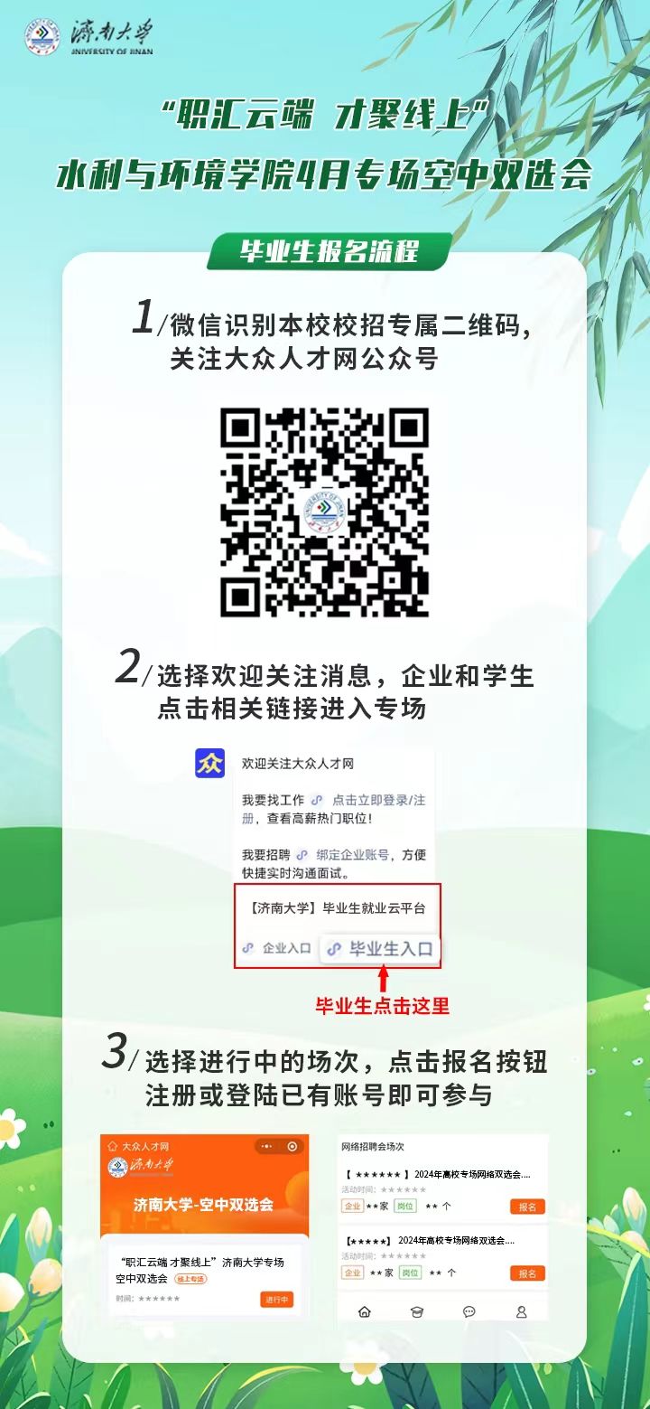 手机微信扫码关注“大众人才网”微信公众号,企业和毕业生分别点击相关按钮进入太阳成集团tyc9728校招端口,点击本学院报名按钮,注册或登录已有账号即可直接参与。