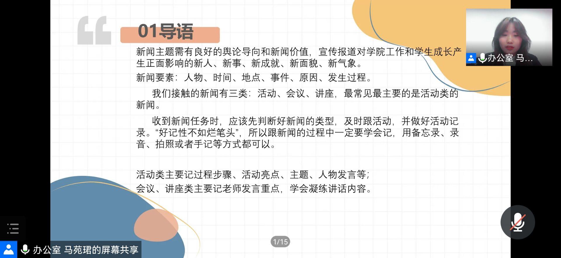 此次培训从策划书书写、PPT使用以及新闻写作和礼仪知识等多方面展开。首先,办公室副部长邢琳婧学姐向同学们讲解策划书的写作、word及Excel的使用技巧。紧接着,宣传部副部长孟卓群学长为同学们讲解PPT中插入视频音频、超链接&动作设置及平滑切换的使用技巧。之后,宣传部部长吴鑫瑶学姐向干事们讲解了关于新闻的写作方法,最后,主持礼仪代表朱嘉仪学姐为参会者讲解礼仪的基础知识。会议期间穿插了三次题目抢答环节并且征集了优秀听会笔记,通过互动的方式促进干事们的参与热情,巩固刚刚学习的新知识。干事们积极参加,认真听讲,并从中获取知识及经验,丰富了干事们的公文知识、PPT使用技巧以及新闻方面的写作方法和礼仪知识。
