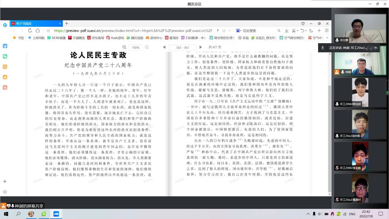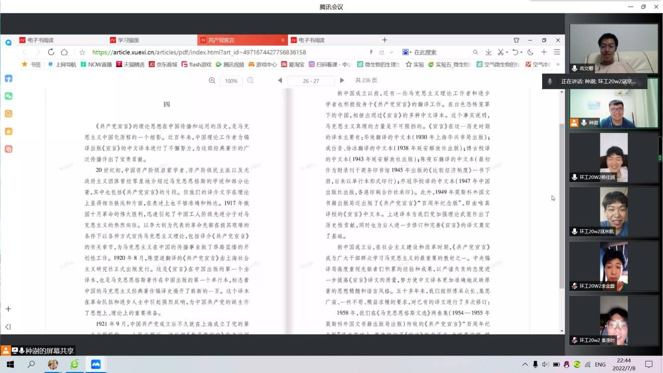 9728太阳集团“青年党史研学社”暑期社会实践团队由指导老师白健和种澍、岳文卿、秦逢时、寇京航、李金蔚、臧少凡、李冰语、杨佳润、张心悦九名成员组成。此次实践活动旨在提高当代青年的科学文化素质,深刻学习党艰苦卓绝的发展历史。本次实践活动主要采取线上腾讯会议的方式进行,团队成员通过观看相关视频学习探讨党的发展历程,同时研究学习习近平谈治国理政、毛泽东选集、列宁选集、马克思恩格斯合集、共产党宣言、“九二共识”会谈记录等相关文章和书籍,通过生动的文字更加深刻体会中国共产党党曲折而漫长探索之路。