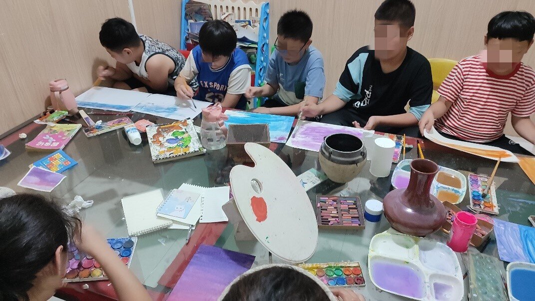 成员张金婷前往山东省潍坊市青州市花都社区与儿童一起画画。米开朗基罗曾说,“艺术家用脑,而不是用手去画”。张金婷耐心地向孩子们讲解绘画的基本技巧、构图形式及表现技法等。孩子们拿起手中的画笔认真描绘、尽情创作,通过一幅幅作品展示自己丰富的内心世界。孩子们一起相互交流、分享心得。通过绘画作品她感受到孩子们内心阳光和希望,更加坚定了努力为他们创造良好的成长氛围的决心。