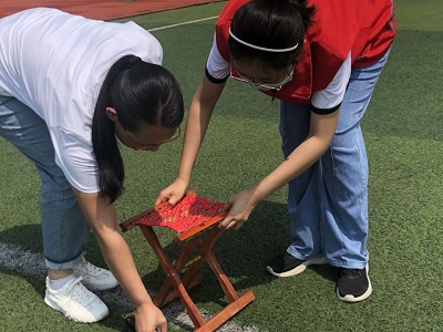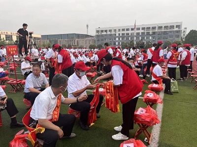7月26日早上6:00,团队成员前往莒县二中体育场。张昕主动请缨担任志愿者队长,组织志愿者签到、拍合照,给志愿者们发放志愿者红马甲,与会场工作人员了解具体工作并安排分工。此次工作的主要内容是摆放4000个下午参会人员需要就坐的马扎。待马扎运来后,志愿者们将成捆的马扎从卡车上搬下,均匀摆放到各地。烈日炎炎下,按照各自分工,志愿者们身穿红色马甲,不惧酷热,开始摆放马扎。他们先摆放了一些量测好距离的马扎,再按照这些马扎进行摆放。全部摆放完毕后,他们用绳子纵列调整,再横向调整。历时一上午志愿者们终于完成了4000个马扎的摆放。结束时,张昕作为队长,给志愿者们发放下午党员大会需要着装的文化衫和小红帽。下午13:00,张昕准时到达莒县二中体育场,组织其他志愿者签到和布置会场。张昕等志愿者们为14名入党50年老党员、14名先锋共产党员、10名优秀第一书记、14名红旗党支部授予绶带。张贴会场标志,协助一些行动不便的老党员入场,帮助发放礼品袋。下午14:30,以“讲公心、守信用、大发展”为主题的党员大会隆重召开,街道全体机关干部、党员、网格员,共3500人参加了会议。经过大会7个议程后,城阳街道庆祝中国共产党成立101周年党员大会圆满结束。志愿者引导参会人员有序离开并打扫会场卫生。最后张昕组织志愿者进行合照,收取志愿者红马甲交给社区工作人员。