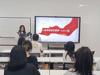 随后,疫情防控优秀青年志愿者代表吴鑫瑶同学从三个方面“初心,走上年轻的战场”、“坚持,守卫防疫的阵地”、“祈盼,共享樱花烂漫时”三个方面讲述了自己在参加社会实践前、中、后的感受。吴鑫瑶同学表示:作为新时代大学生,应当用实际行动承担青年责任,积极走在防疫前列,积极投身抗疫前线。在实践过程中,虽然她只负责了协助社区及时掌握群众需求,做好人员登记、体温测量、拆分棉签、秩序引导、分发核酸贴纸等简单的防疫工作,但却切身体会到了“从群众中来,到群众中去”的深刻内涵,认识到只有把个人命运与国家和社会的命运联系起来,这才是青年正确的成长成才之路!