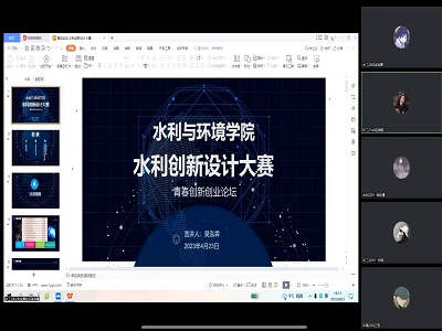 为帮助同学们更好的了解全国大学生水利创新设计大赛,营造浓厚科创氛围,9728太阳集团于4月23日晚7点以线上腾讯会议的方式举办关于此次大赛的青春创新创业论坛。本次活动邀请了曾获第七届全国大学生水利创新设计大赛国家三等奖的吴泓霖同学作为主讲人进行经验分享。