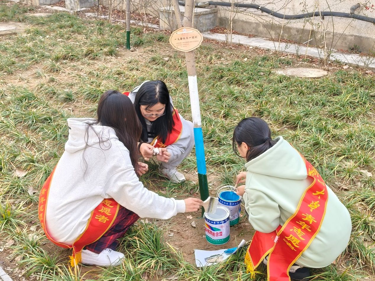 学院学生会团支部在校内开展了树木绘画美化活动。在植树节当天,志愿者们给学生会团支部的同学分发绘画工具,组织他们有序展开树木绘画装点活动。活动中同学们分工协作,用蓝色、白色和绿色等象征环保的颜色装点19棵梨树,表达对生态环保的青年热情。