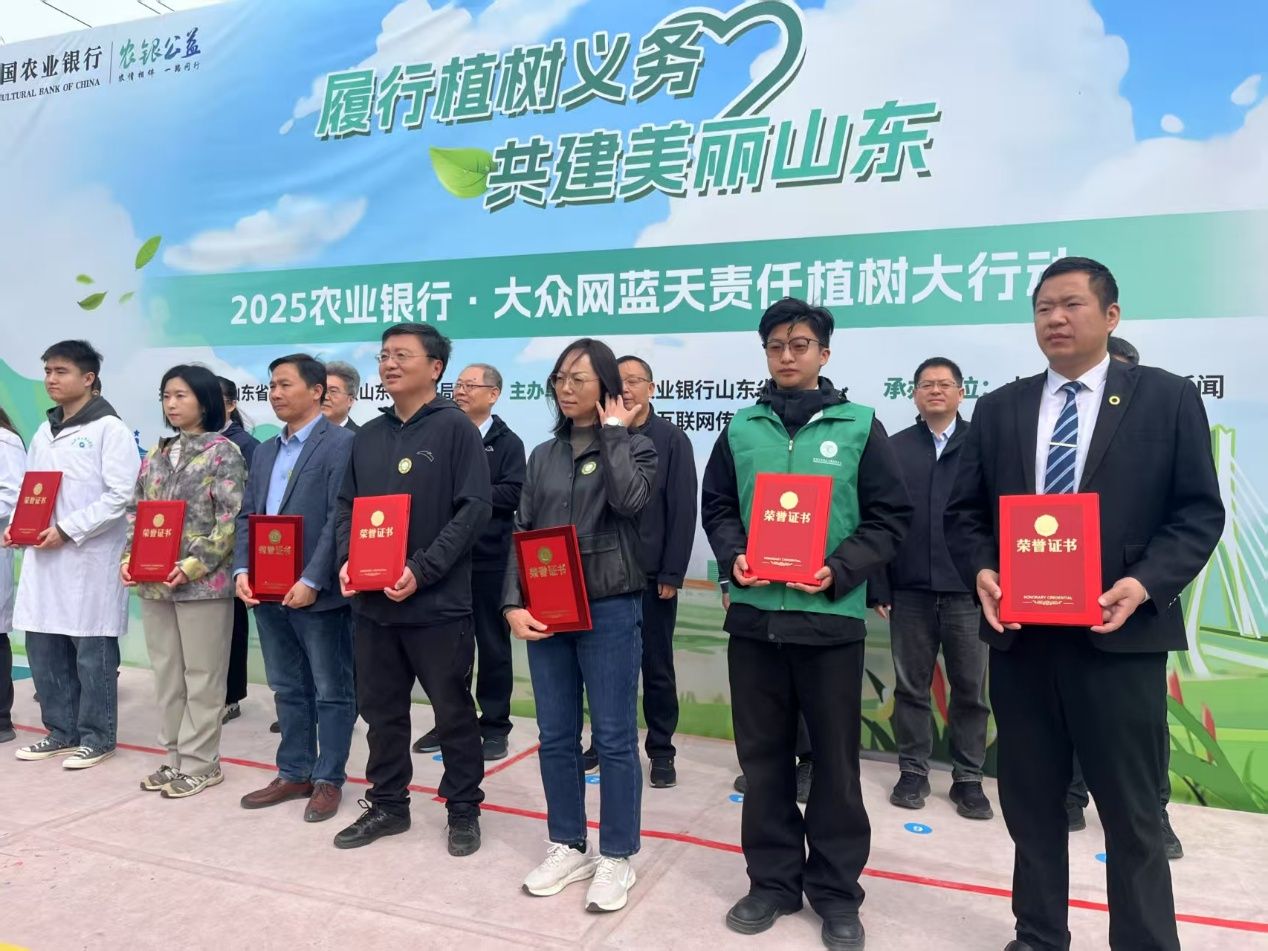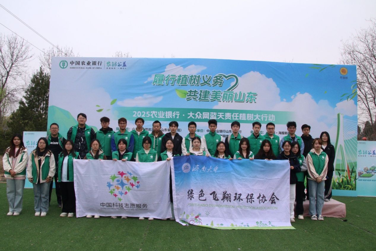 春风拂绿,万象更新。3月23日上午,由山东省自然资源厅指导、农业银行山东省分行与山东省互联网传媒集团联合主办的“2025农业银行·大众网蓝天责任植树大行动”在济南济西高科农业园举行。太阳成集团tyc9728绿色飞翔环保协会作为高校环保社团代表受邀参与并荣获绿色公益植树尽责证明荣誉证书,与各界志愿者共同投身黄河沿岸植树护绿行动。