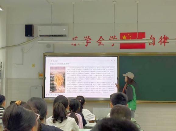 上午10时40分,宣讲活动在趣味盎然的暖场互动中拉开帷幕。宣讲团队以精心制作的PPT为载体,沿着历史脉络,串联地质变迁、神话传说与古代水利工程,生动展现黄河作为中华文明摇篮的深厚底蕴。从“河出昆仑”的地理概览,到半坡文明、二里头遗址的文明起源,学生们透过丰富的图文与案例,直观感受黄河在中华文明演进中的核心地位。