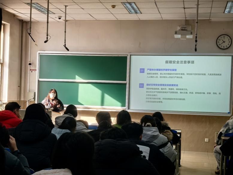王老师围绕寒假安全主题,结合诈骗案例,着重强调了防盗防诈骗的相关内容,同时明确实验室操作规范、疾病预防、极端天气以及宿舍水电、消防等安全要求,进一步强化了毕业生的安全责任意识与风险防范能力。