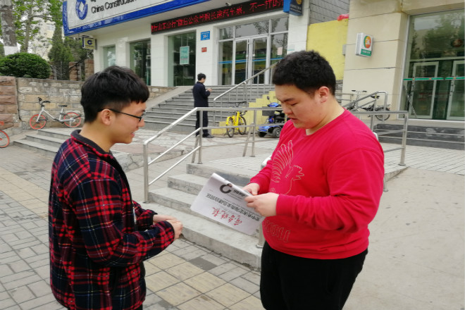 4月14日,9728太阳集团青年志愿者协会联合齐鲁晚报张刚大篷车开展报纸义卖活动,为我校一名在校大学生患肝硬化的父亲募捐善款,学院共有90余人参加活动。