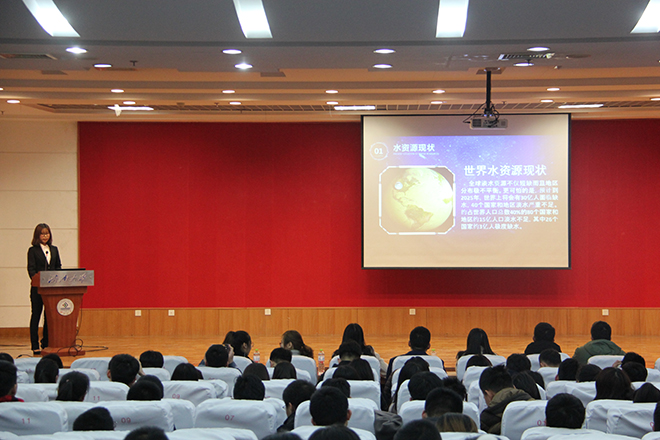 活动以班级为单位,用PPT展示汇报的形式进行比赛宣讲。各班发言人均从水资源的保护、水资源现状及班级所参加公益活动等多方面展开陈述,让同学们深刻认识到水资源的重要性,并反省自己在生活中用水态度。