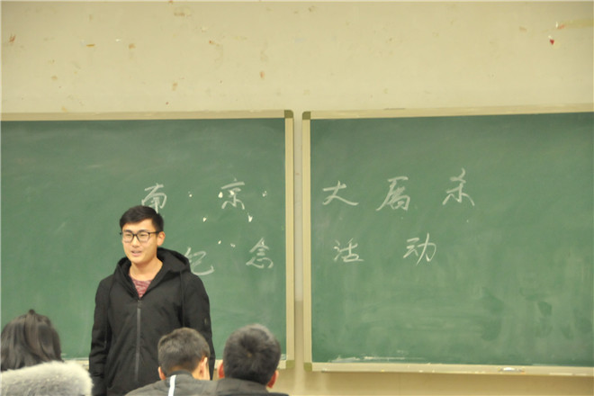 下午五点半,同学们聚集在第十教学楼205教室,共同观看了影片《南京!南京!》的部分片段,视频中日本人残杀中国同胞的场景触目惊心,让同学们的内心深受震撼。影片结束,全体默哀三分钟,为遇难者同胞哀悼。随后,志愿者负责人向同学们阐述了南京大屠杀的残酷事实、事件背后的历史及给中华民族带来的巨大灾难等等,让同学们对于南京大屠杀有进一步了解,对这份历史能有更客观的认识。他强调祭奠死难同胞,绝不是为了发思古之幽情,也绝不是囿于历史伤痛不能自拔,更不是宣泄仇恨,而是为了牢记历史创伤,吸取历史教训,居安思危,痛定思痛,知耻后勇!