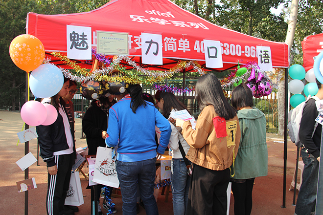 希望之星英语口协用音乐带动现场气氛,报名即可抽奖的环节吸引了众多同学的加入。应时代需要而新组建的Charming Spoken English Club映入眼帘,社团工作者对同学们进行一对一讲解,推出主打特色。两个社团让同学们意识到当今英语口语的重要性,点燃了同学们学习英语口语的热情。
