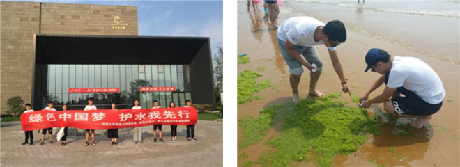 金沙滩因沙细如粉、色泽如金享誉盛名,作为中国面积最大、风景最美的沙滩,此处游客络绎不绝,海水浴场也因沙质松软、滩平坡缓广受当地居民及游客的喜爱。实践团队在金沙滩、海水浴场实践过程中,通过发放调查问卷、采集水样、收集漂浮浒苔等调研方法,注重探讨人类活动在水质现状中的影响因素,综合分析浒苔衍生的深层次原因。同时,实践团队注重弘扬水资源保护理念,宣传水资源保护知识,力求为践行水资源保护的时代使命增砖添瓦。