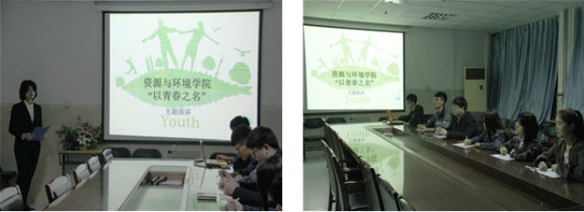 4月7日,为深入贯彻党的十八大精神,建设丰富多彩的校园文化,以良好的青春风貌向党的十九大献礼,资源与环境学院于九教301顺利举办“以青春之名”主题演讲活动。学院2016级各班推选出的十名同学到场参与。
