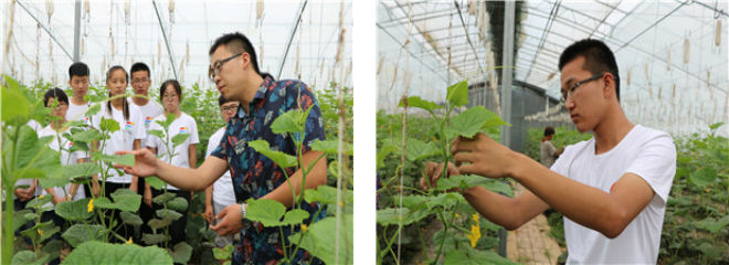 上午9点,实践团成员在学院辅导员白健老师的带领下到达劳作地点,并认真向专业技术人员学习大棚黄瓜的“搭架”、“引蔓”、“整枝”技术。随后,同学们共同参与,帮助农民阿姨一起工作。由于缺乏工作经验,志愿者们起初只能一个叉一条枝的进行劳作,随着学习和实践的积累,同学们都能熟练的对黄瓜进行作业。过程中,白老师向团队成员讲解了“搭枝”、“引蔓”、“整枝”的科学原理,以及对黄瓜产量的益处和瓜藤高度的影响。同学们在学习知识的同时也收获到劳动的幸福与成就感,切实做到知识与实践相结合。