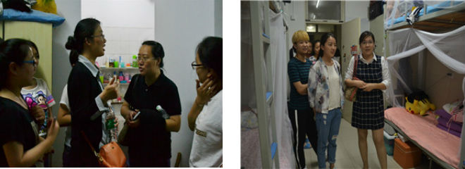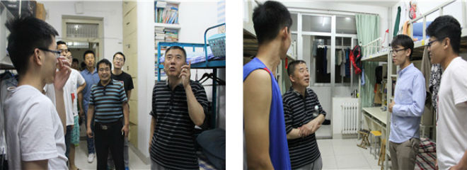 晚上9点,老师们在学院门口集合后分别前往南苑和北苑的学生公寓。过程中,班主任辅导员分别针对分管的年级和班级的学生宿舍的卫生状况进行检查,并向同学们强调用电安全的重要性,要求同学 们保持宿舍清洁,学习用电安全知识,禁止在宿舍使用大功率电器等。班主任老师与自己班级同学就生活问题进行亲切交流,希望同学们平日在宿舍多看书,少玩游戏,保持宿舍卫生整洁,养成良好学习、卫生习惯。针对同学们反映的日常生活问题,老师们耐心的进行解答。侯老师在宿舍里向同学们分享大学时期在宿舍的作息 时间和生活习惯,同学们纷纷表示要珍惜美好的青春时光和优越的住宿条件,严格遵守学校学院的相关规定,重视宿舍卫生及安全问题。