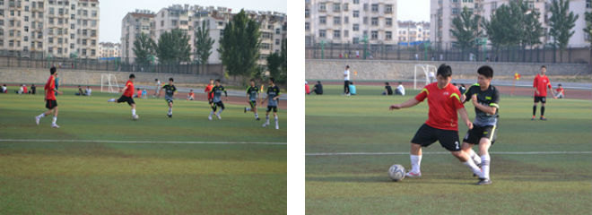 下午5点,北院操场上聚集了众多观众为比赛呐喊助威。随着裁判的一声哨响,比赛正式开始。在现场观众的加油声中,双方球员很快进入了状态,球场上队员们面对一上来就攻势凌厉的外院男足毫不示弱,细腻的脚法与巧妙的配合,让看台上同学们的呐喊声越来越高。但外院男足同样表现出了不俗的实力,比赛一时陷入了胶着状态。十分钟之后,我院球员后防失误,对方前锋队员单刀直入,一脚抽射改写了比分,以一球优势暂时领先上半场。中场休息时,队员们迅速调整状态,认真商讨比赛战略。