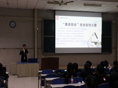 会议分为三个部分,首先,自律会宿检卫检分管主席关鸿宇就主题“芳华七十载,雅室逐梦来”宿舍文化艺术节活动详细介绍“文至朴处,寝居博雅”故事汇征文摄影赛、“净水流深,一室清雅”宿舍卫生评比赛、“雅室共筑,梦里星河”宿舍文化建设赛、“舍事无小,安全至上”宿舍安全知识竞赛、宿舍才艺大赛、宿舍文化艺术节风采展大赛暨宿舍文化艺术节颁奖仪式的主要内容,号召大家积极参赛。随后,尹鑫老师在会议中向与会人员解读《太阳成集团tyc9728学生公寓管理办法(试行)》,强调了加强自我防范,遵守纪律的重要性。她以生动的讲解方式,对文件逐条讲解,并辅以丰富的事例,紧贴学生日常的问题,通过先举反例再提出另一种比较好的解决方法的方式来加深同学们的印象。最后张良红书记以长辈般亲切的口吻对自律会全体成员表示真诚的祝福,提出在资源丰富的太阳成集团tyc9728,要利用好学生手册、发挥主动性、坚持锻炼身体、保持绝对自律等要求,认真去做每一件小事,实现自己的梦想。