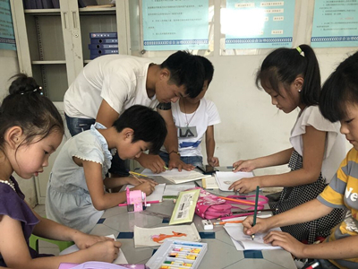 愉快的课间休息后是手工课,我们将小朋友们分为6组,每组下发一套彩色铅笔、一套油画棒、每人一张白纸两张彩纸,在叮嘱大家注意安全,有序使用并爱护公共用品后,我们先给小朋友们讲述绘制的主题和几种简单的表示方法,随后就将时间交给小朋友们自己绘制。绘制期间,个别小朋友由于争夺彩笔造成了不愉快,老师们及时发现并耐心安慰疏导,最终相互道歉友好解决。临近下课时间,小朋友们的作品陆续上交,我们从中挑选出了许多富有创意的作品,对小作者提出表扬之余在教室外布置了作品展示墙。在随后的支教之旅中,我们还将继续开展书法绘画等课程,优秀作品均有被展示的机会。