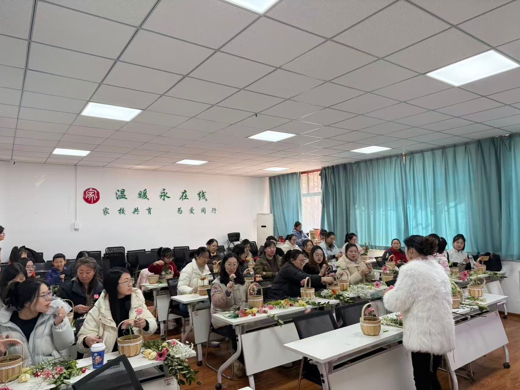 活动特邀专业花艺师现场授课,详细讲解花材养护、色彩搭配及插花技巧,并分步骤进行示范指导。现场花香浓郁,春意盎然,玫瑰、康乃馨、尤加利叶等各类花材错落有致地摆放。女教职工们在花艺师的指导下,充分发挥巧思与创意,精心修剪、巧妙组合,将一枝枝鲜花转化为一件件清雅别致、富有意蕴的花艺作品。大家一边创作,一边交流分享,现场花香四溢、笑语不断,洋溢着温馨喜悦的节日氛围。